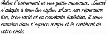 La musique live flotte dans les airs; elle donne une agréable couleur à vos conversations. Lionel, par sa musique d'ambiance, ses musiques de film, ses standards du jazz anime en toute discrétion vos réceptions les plus raffinées.
